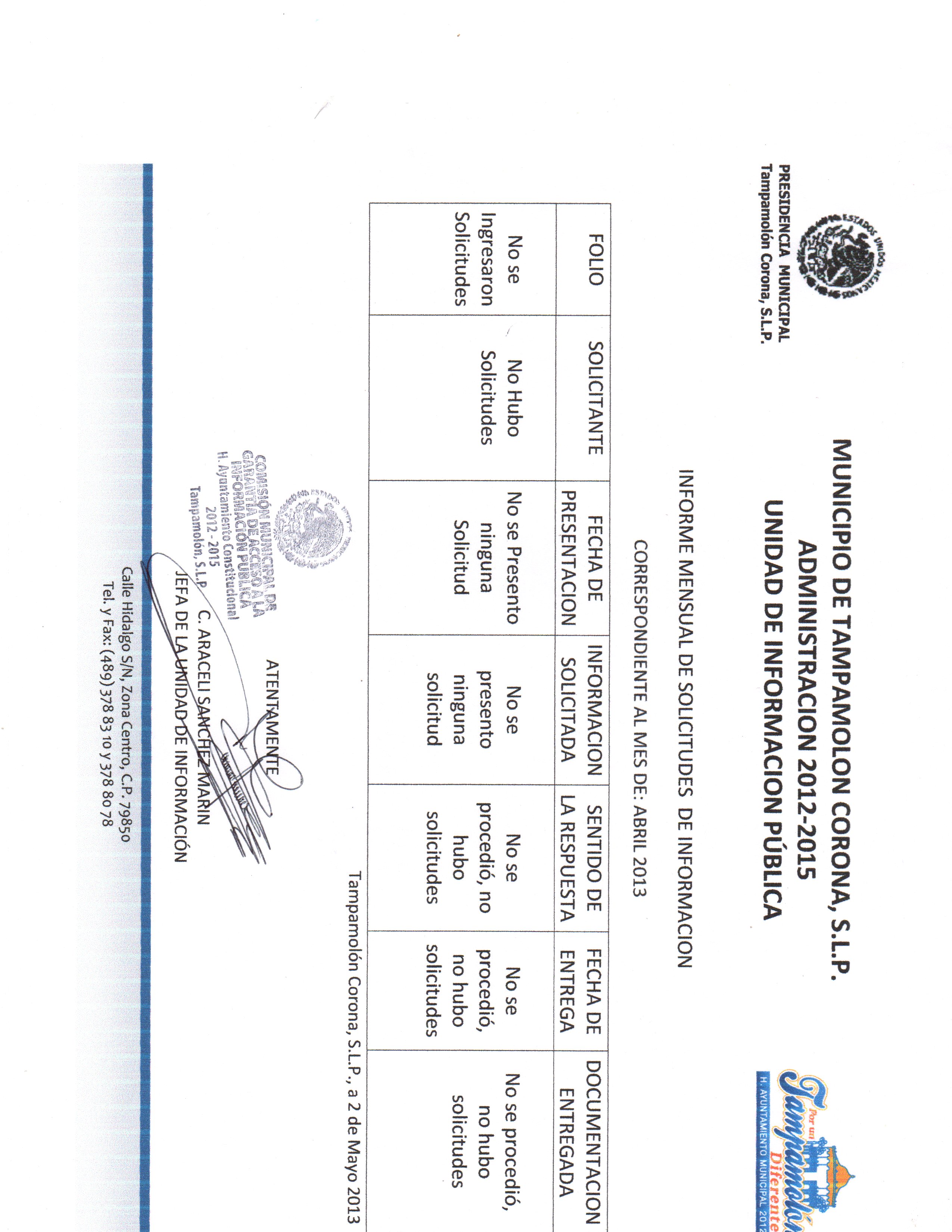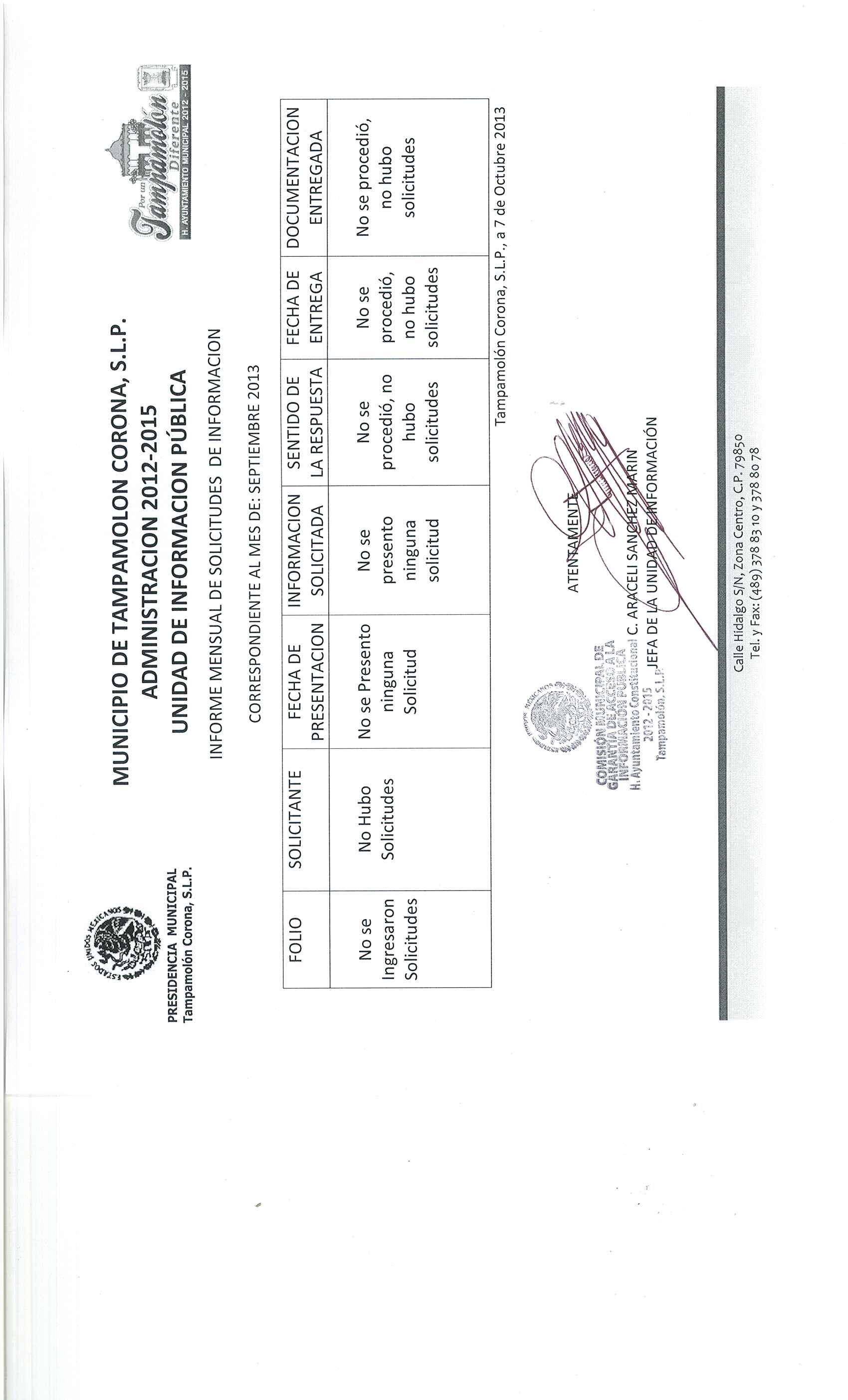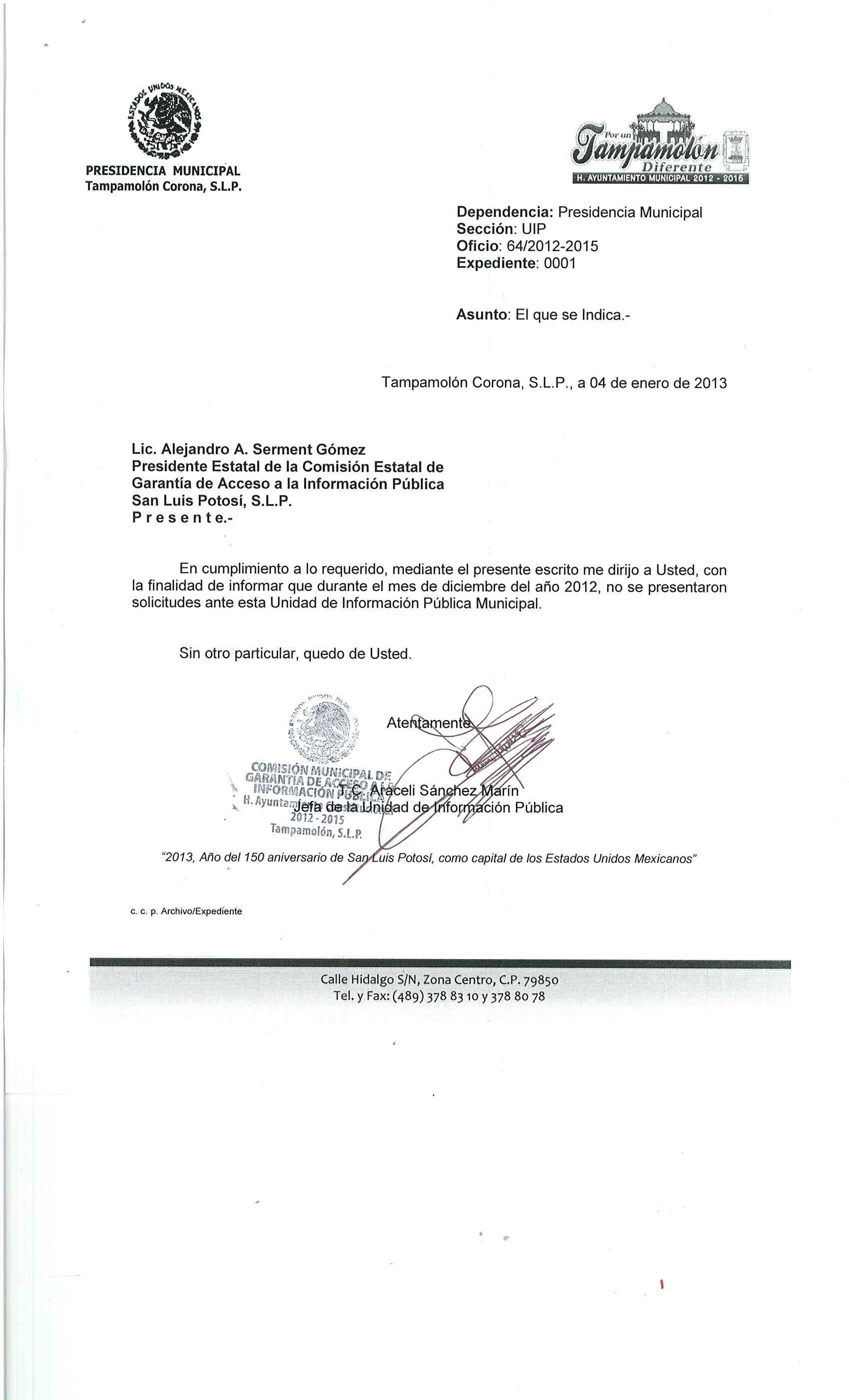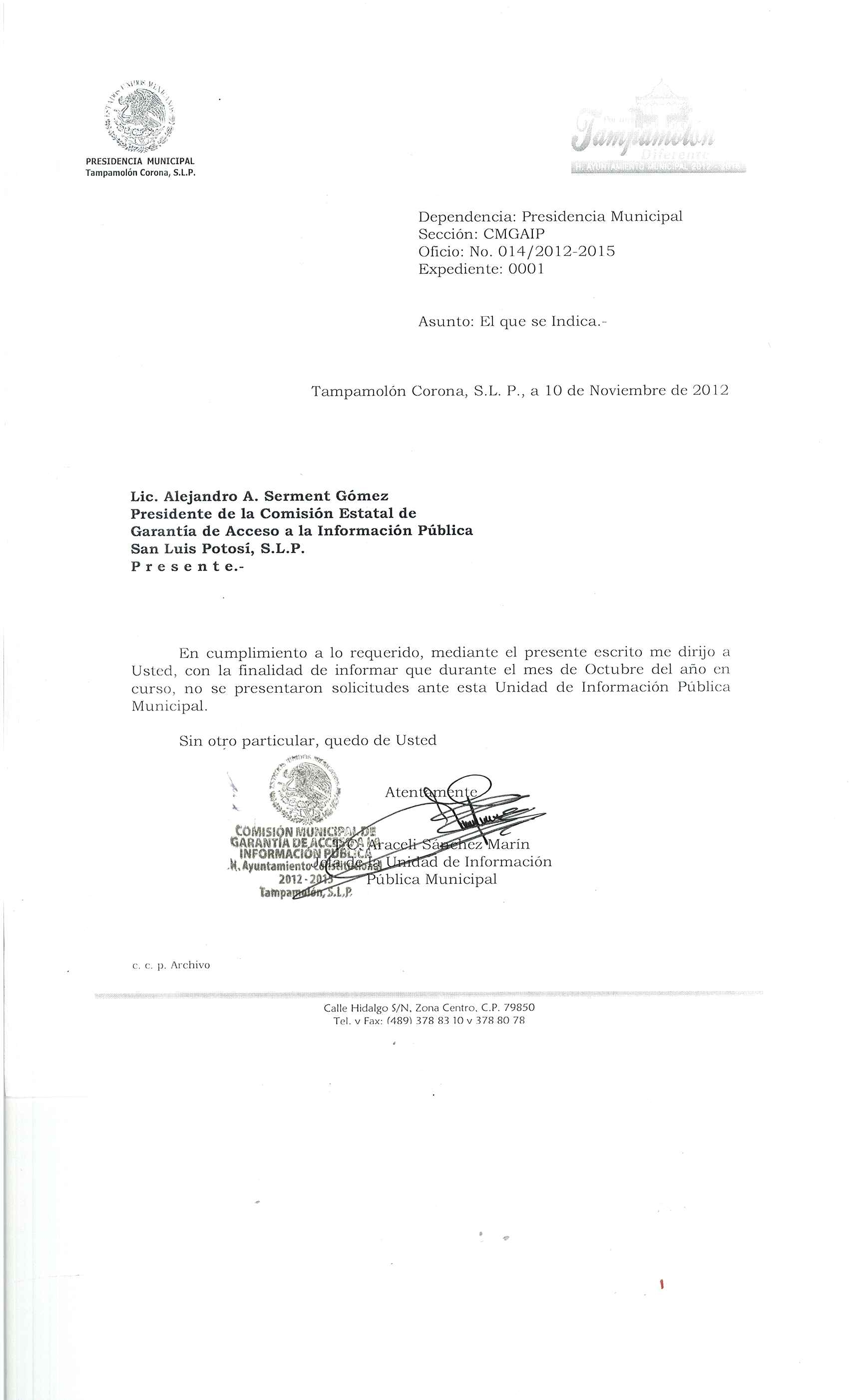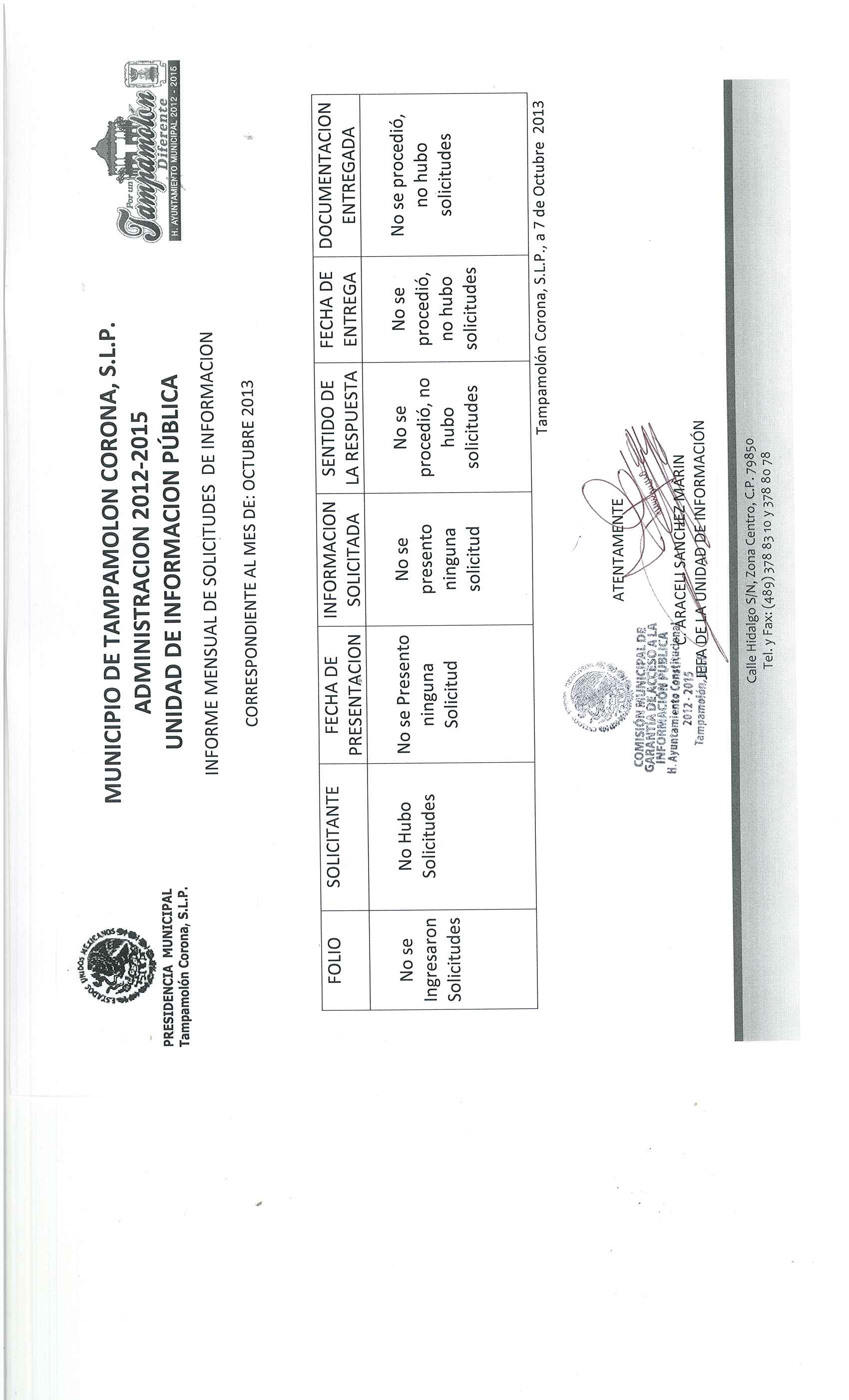 Domicilio de la Oficina: Calle Hidalgo S/N, Zona Centro, Tampamolón Corona, S.L.P.