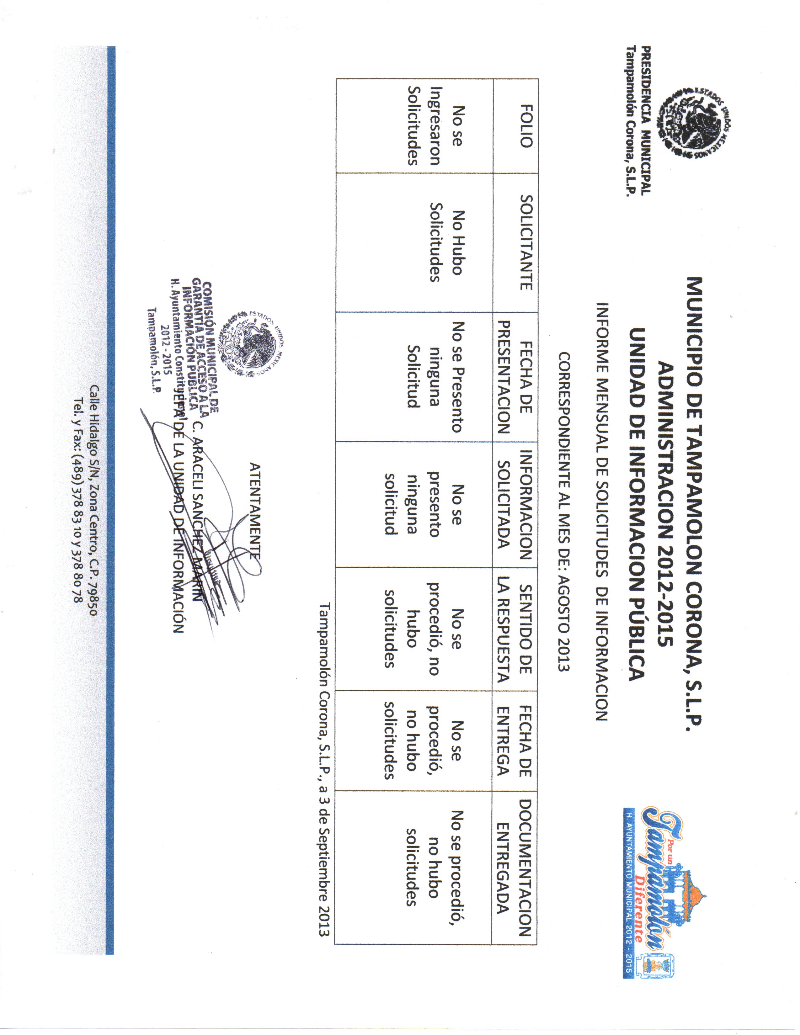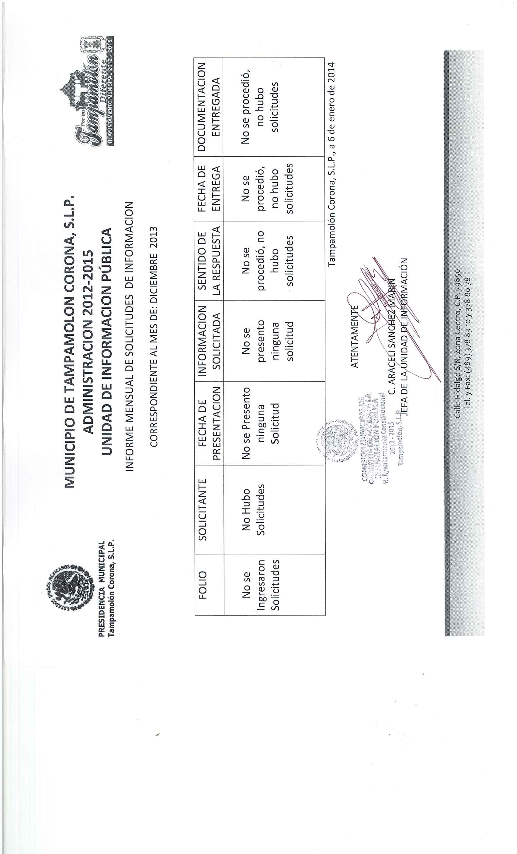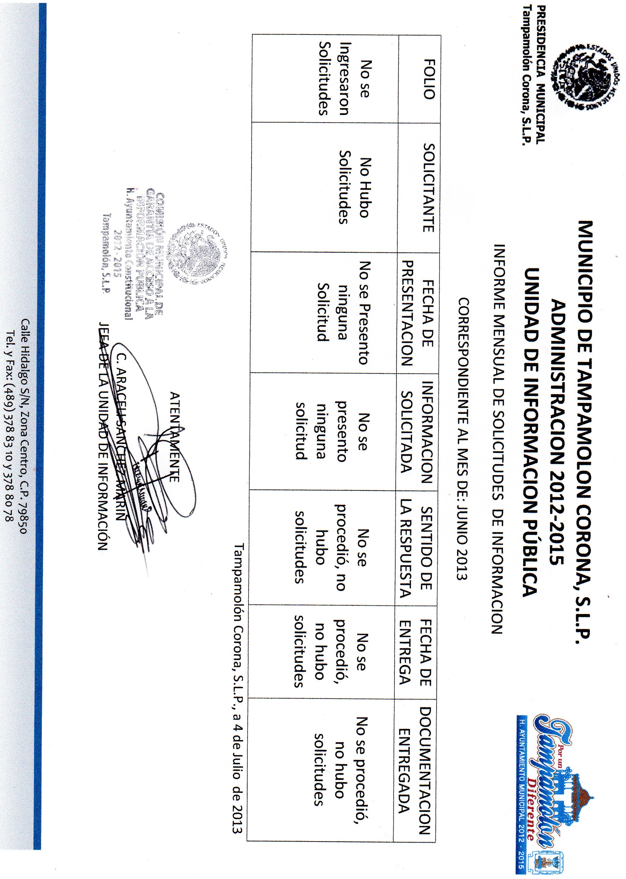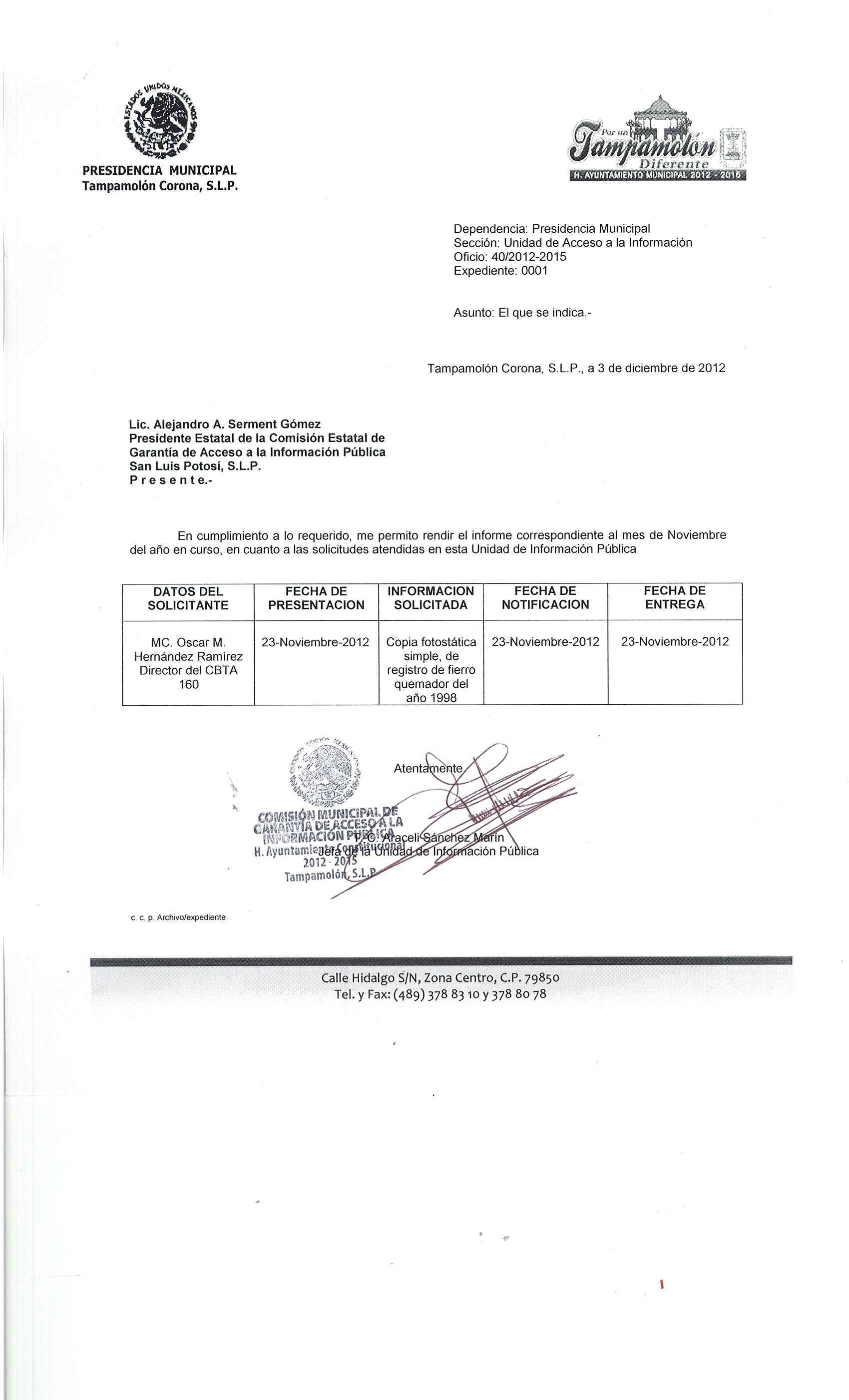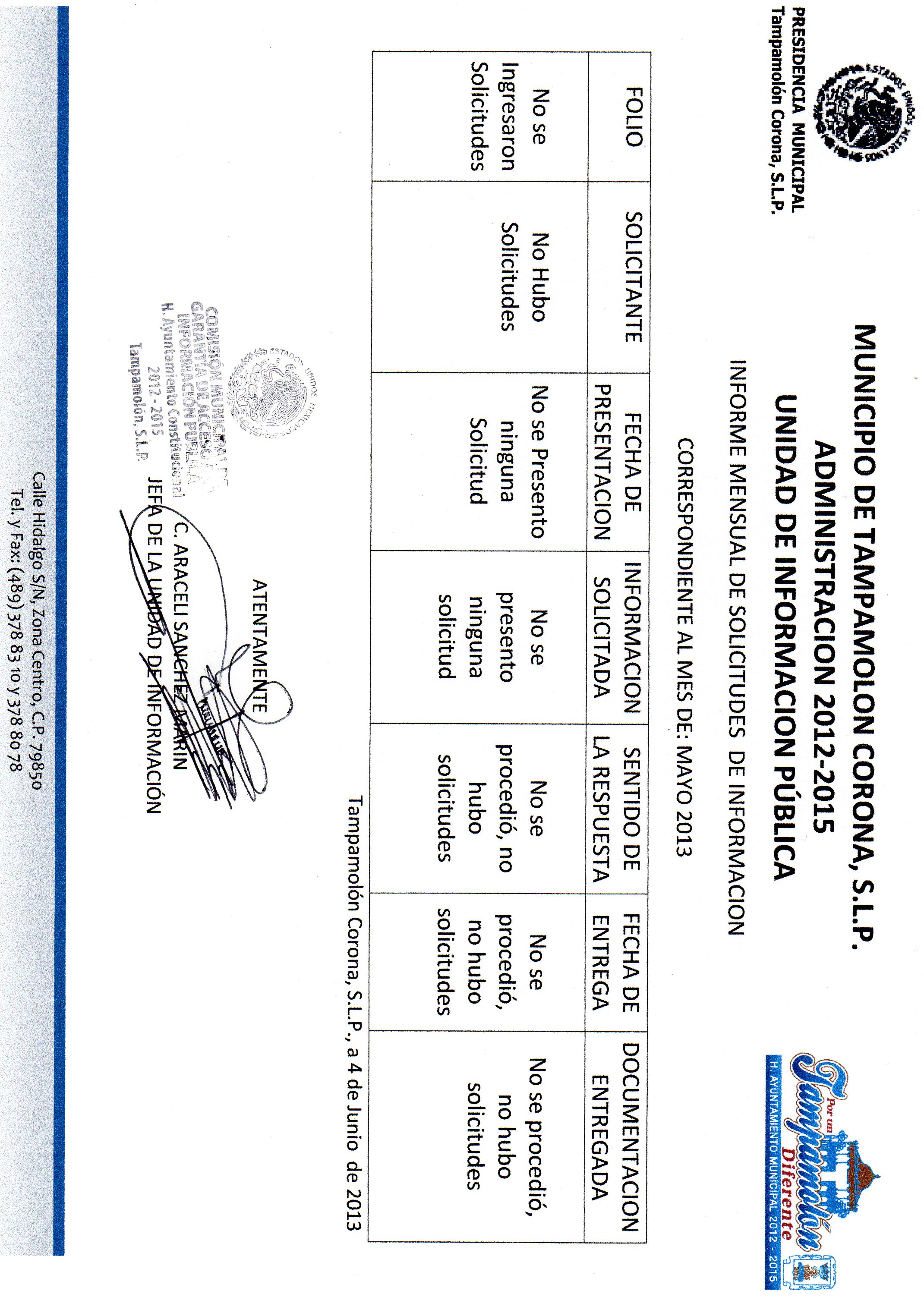 Domicilio de la Oficina: Calle Hidalgo S/N, Zona Centro, Tampamolón Corona, S.L.P.